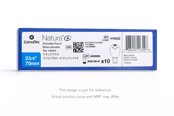 he Convatec Natura+ Pouch (70mm, Code: 416422) is a drainable ostomy pouch with a clipless InvisClose® tail closure, designed for comfort, hygiene, and discretion. It fits securely with 70mm Natura® skin barriers, features a transparent front, soft, quiet material, and an odor-barrier film—making it an ideal choice for colostomy and ileostomy care.